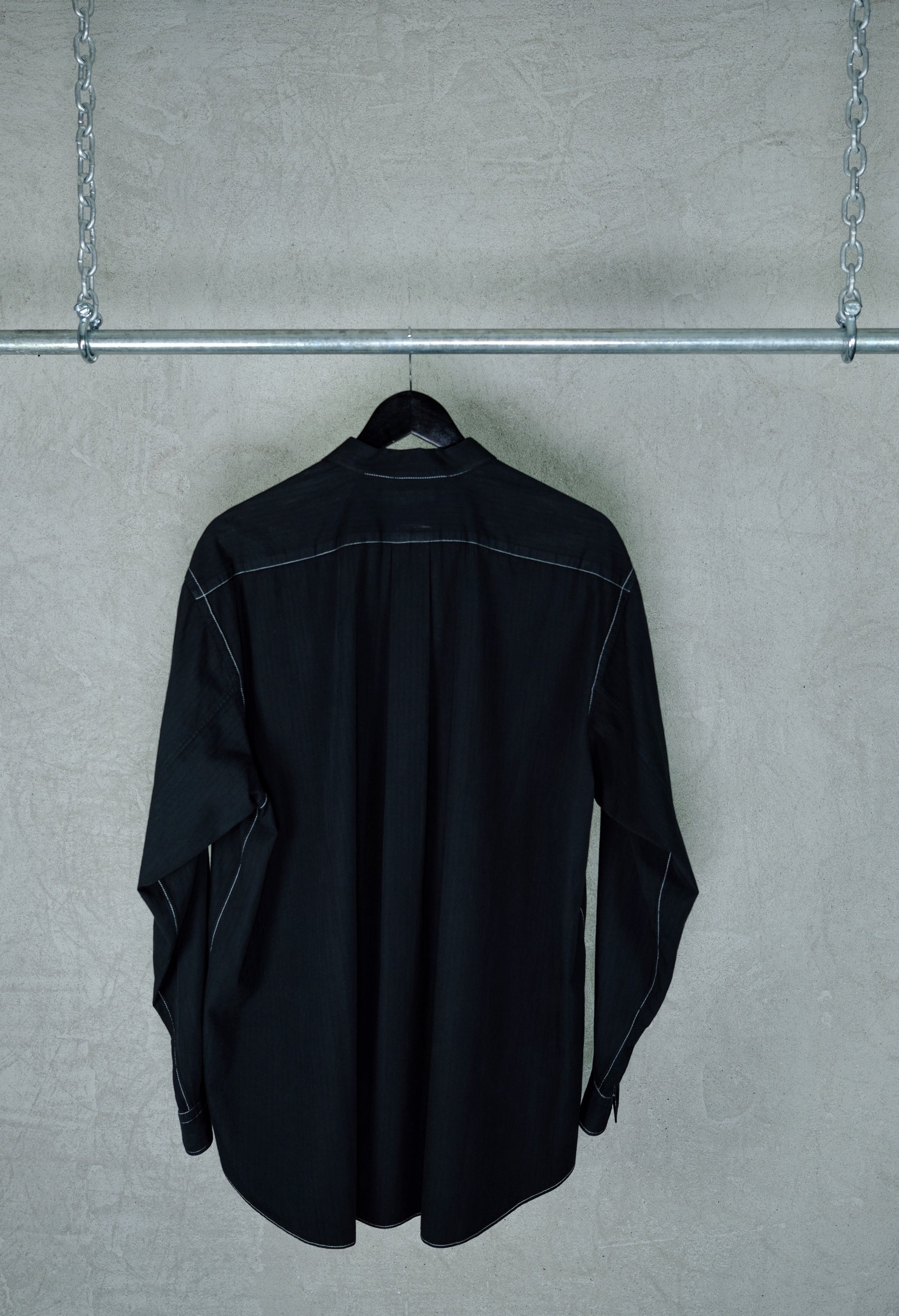 Black long-sleeved shirt from Comme des Garçons Homme Plus, featuring Rei Kawakubo’s signature contrast white topstitching, oversized pocket, and deconstructed seam lines.
