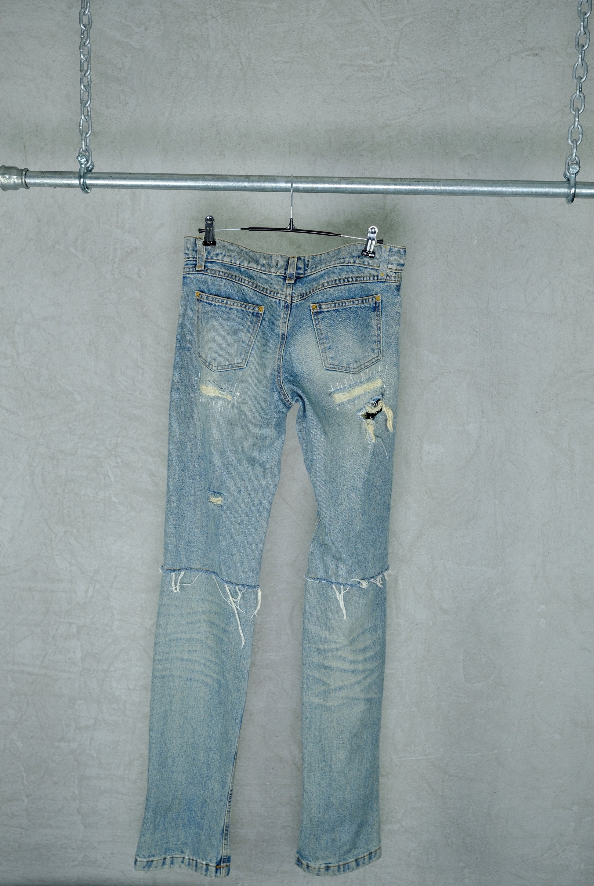 Features a slim straight fit with signature hand-finished fraying and a light blue vintage wash, true to the label’s early-2000s aesthetic of sensual minimalism and lived-in texture.