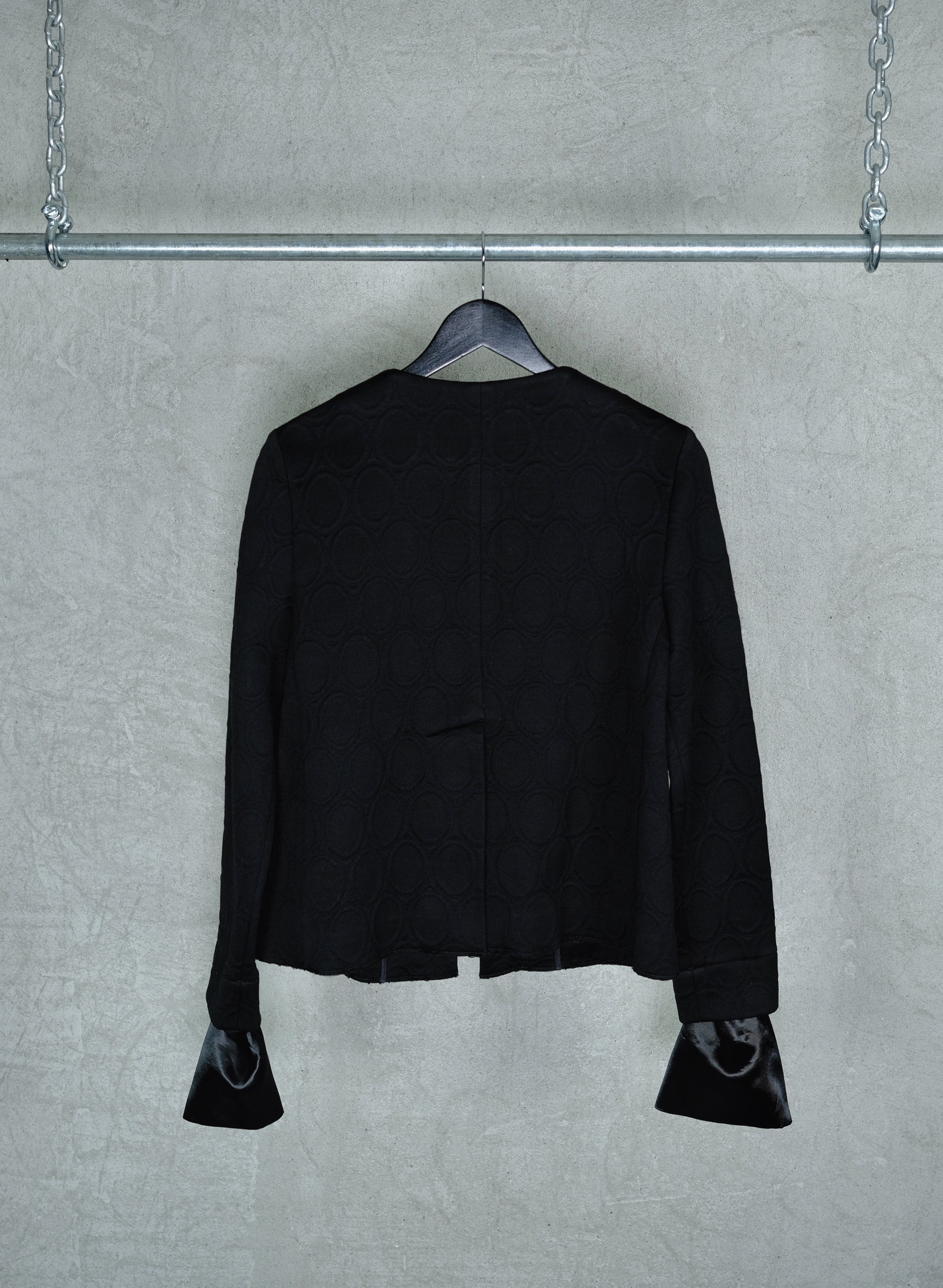 Elegant black Marni jacket with a subtle circular jacquard texture and a clean, collarless silhouette. Crafted in Italy from a richly textured fabric, the piece reflects Marni’s early-2010s approach to sculptural minimalism and precise, architectural tailoring.