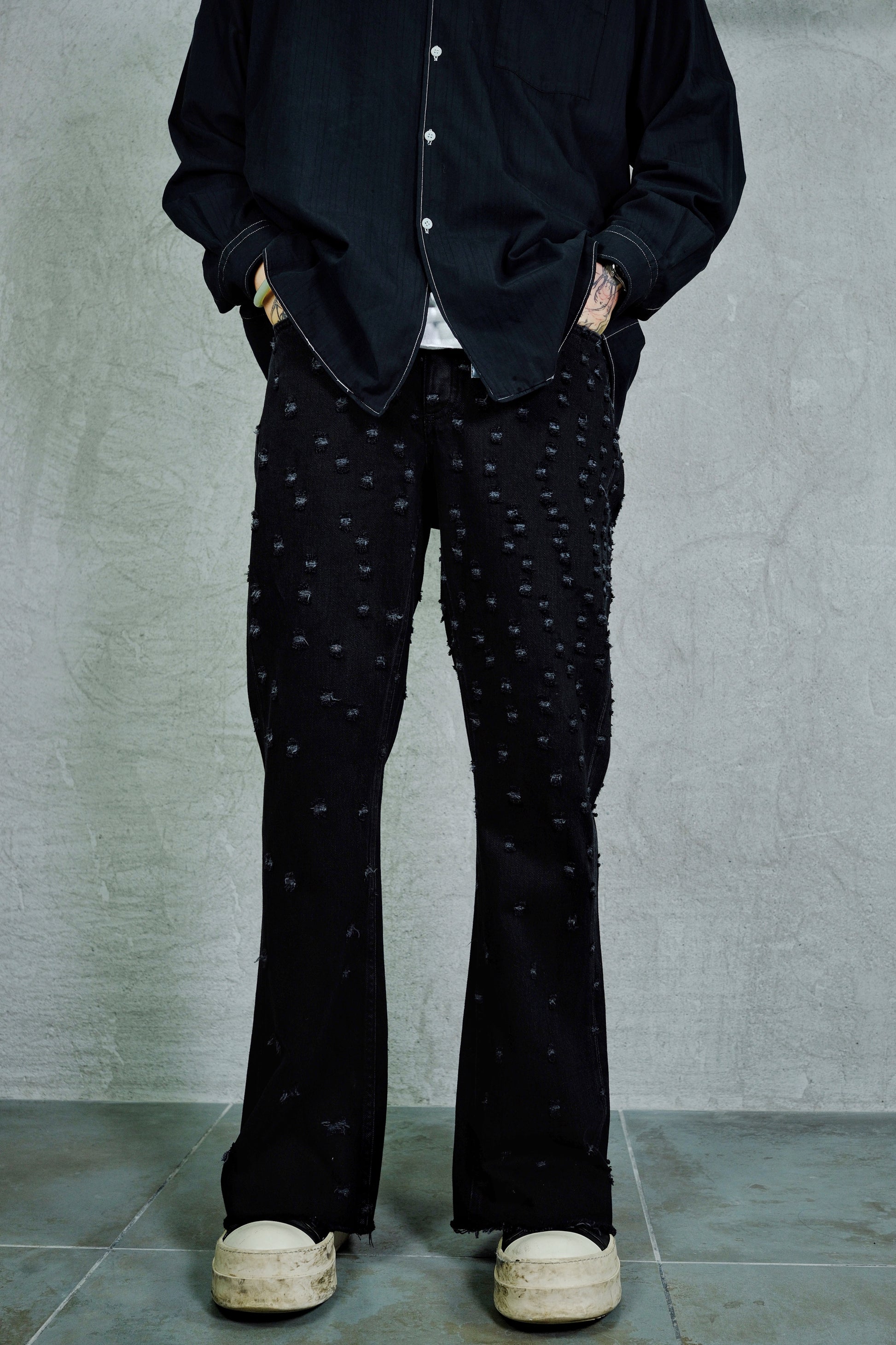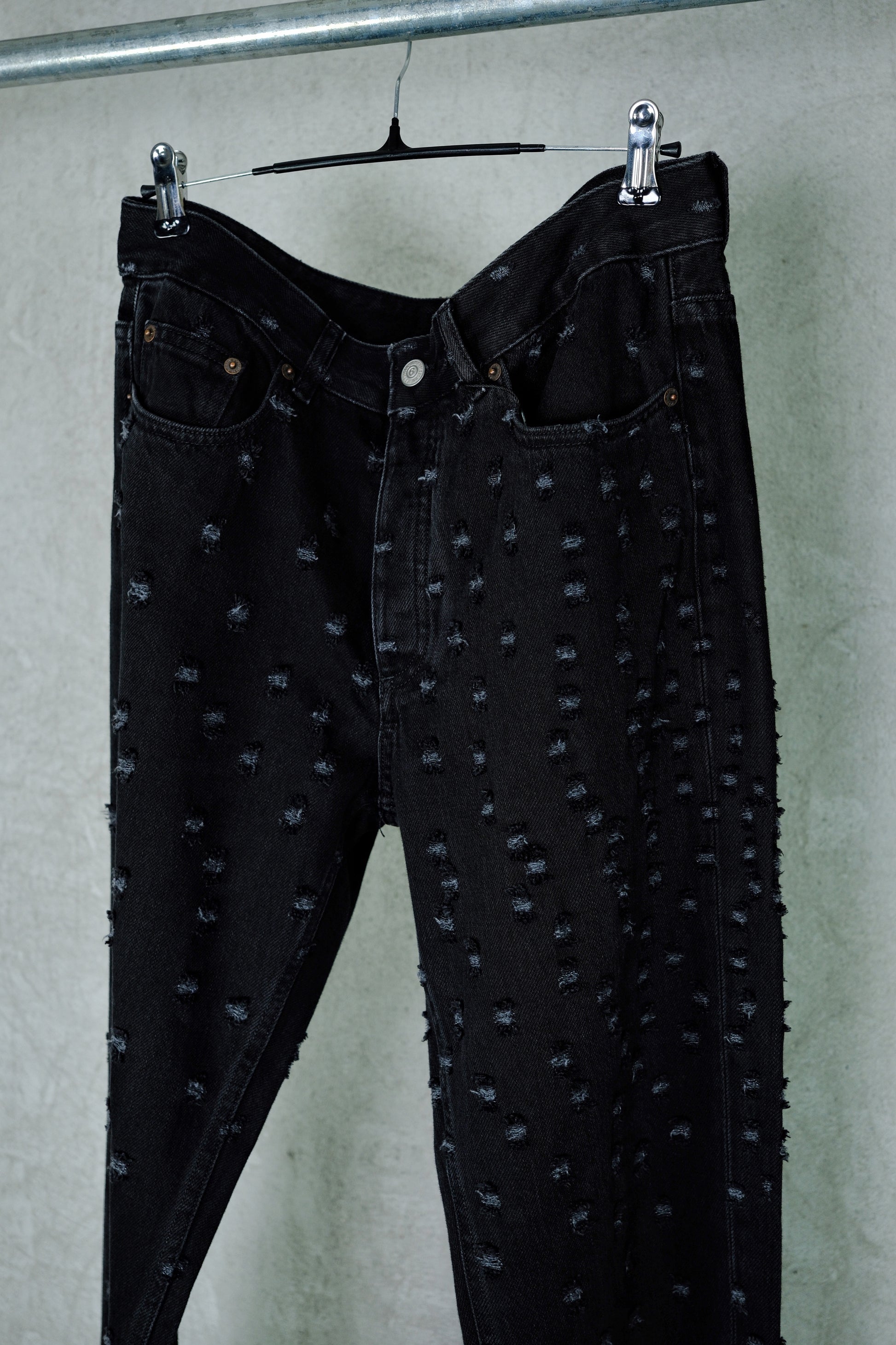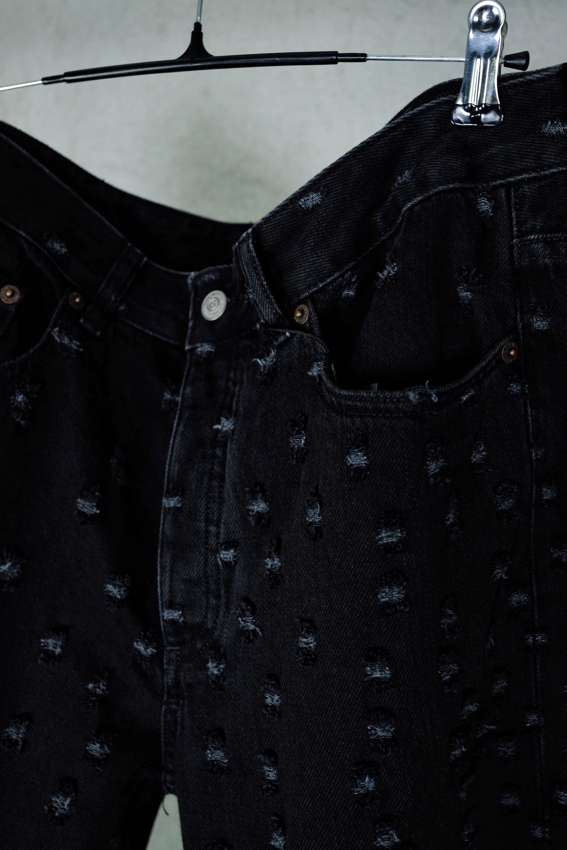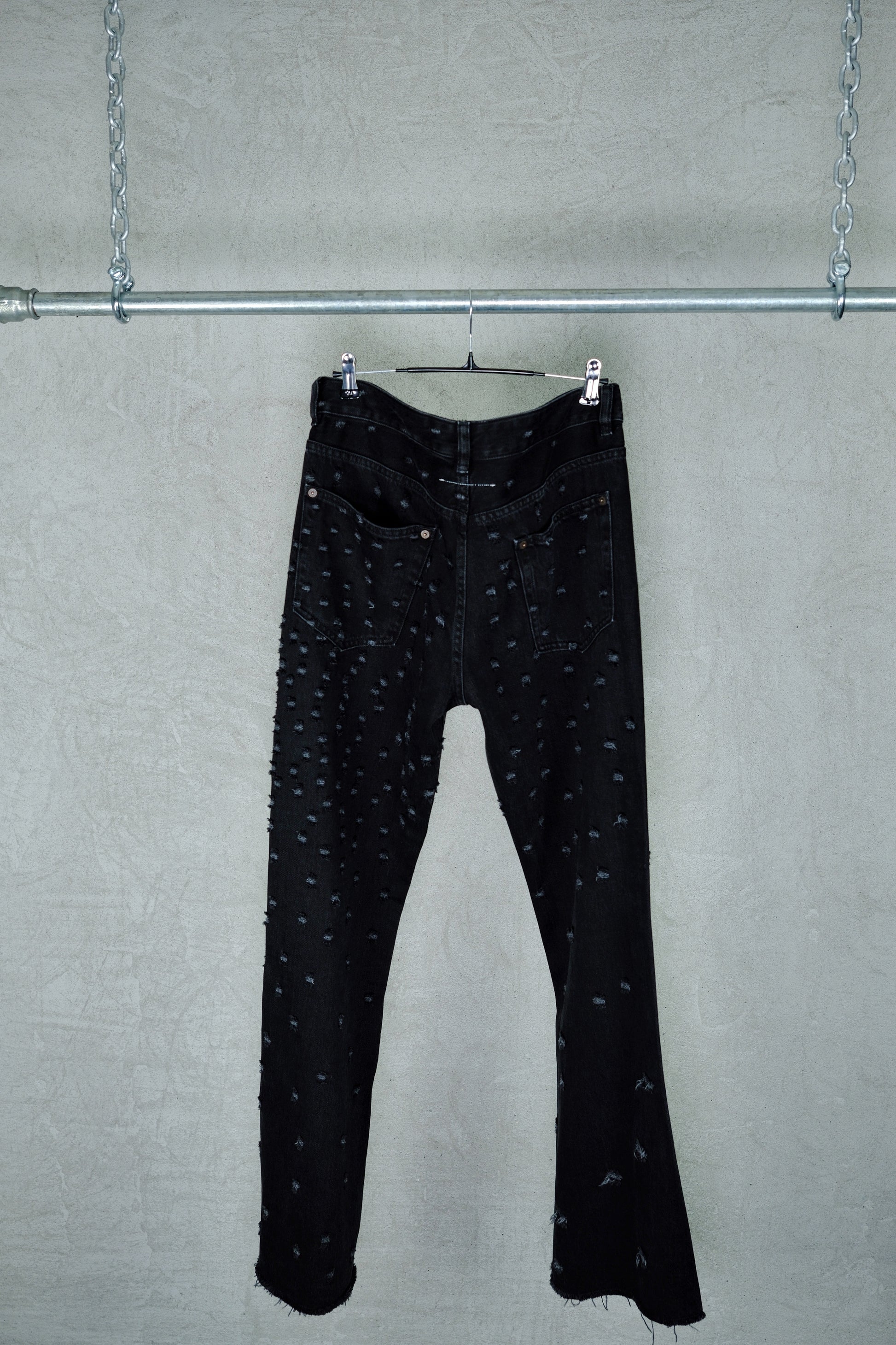 Black deconstructed jeans from MM6 Maison Margiela, featuring the label’s signature distressed texture and split hem construction.