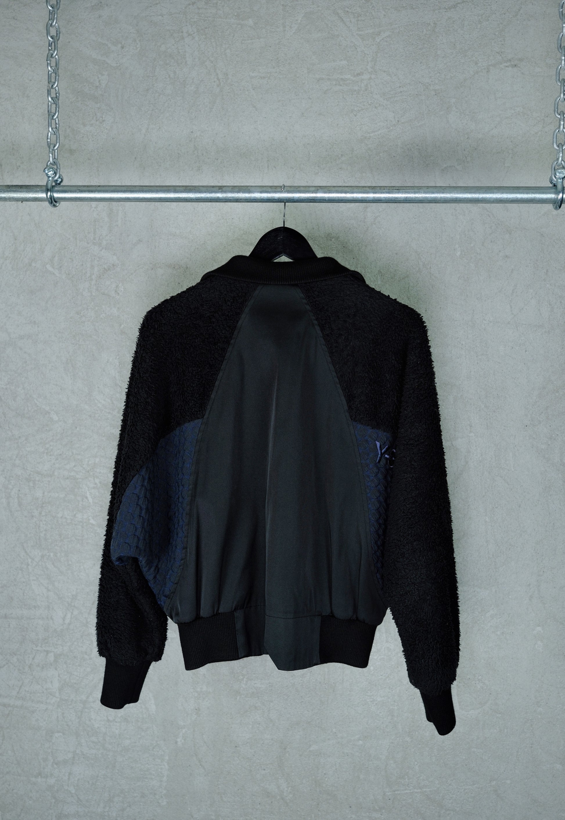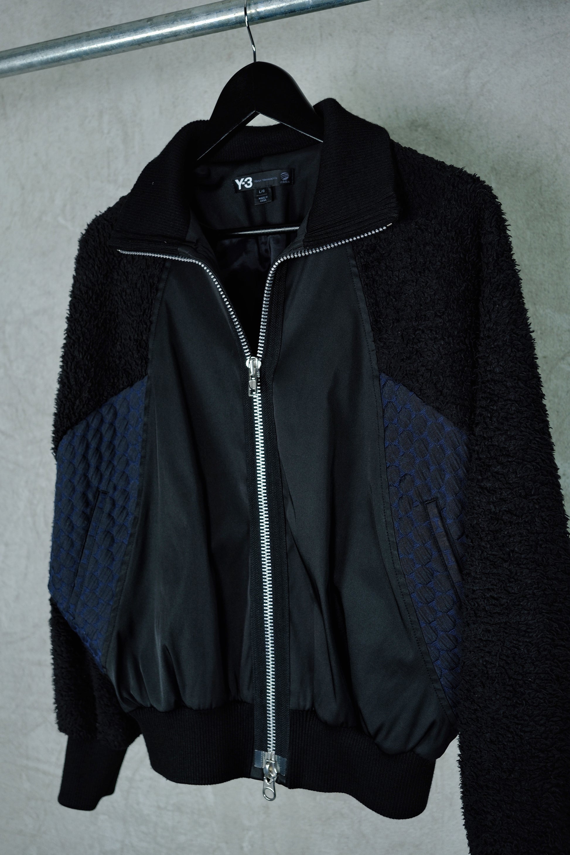 Rare Y-3 bomber jacket in black technical fabric with contrasting fleece sleeves and a silver two-way front zip.